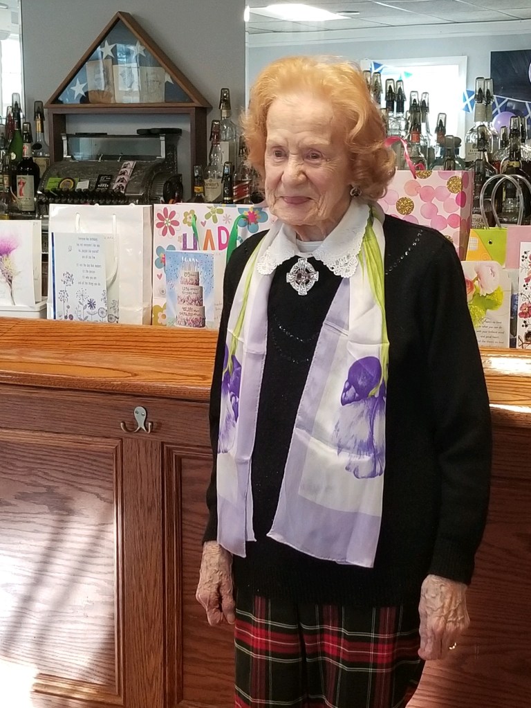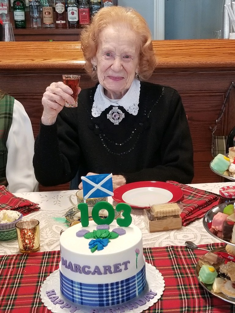 Sometimes, people would ask Margaret what her secret was for living a long life. She would just smile and shrug. I know she didn’t worry about cholesterol or calories. She ate meat and potatoes and soup. She was a great baker of sweets as Hamish loved his desserts: shortbread and “millionaire shortbread” topped with layers of caramel and chocolate; currant slices; and one-layer cakes, filled with cream and raspberry jam and dusted with powdered sugar; she made tapioca pudding and rice pudding, too. She stayed active for most of her life, waiting on customers in the kennel until she and Hamish retired, cooking and cleaning the house, and exercising on a treadmill she kept under her chair. Interestingly, she never learned to drive—so maybe that was one less stress in her life. Oh, and she read her horoscope every day. She brought a clipping of one to church when she was 102 and it promised that she would live to be 103. Well, what do the horoscope writers know, anyway?