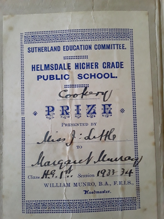 She was the second of six children—one older named Jeannie and four younger: Jessie, William, George, and James. She was a good student and was recognized with a certificate and prize for cooking from Helmsdale Higher Grade Public School for the school year 1933-34. The prize was the book, Great Expectations.