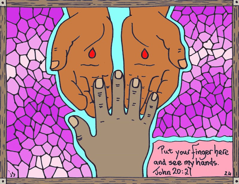 How do they recognize him? He is known by his scars, scars that could have been fully healed by God the Father in his raising but were left so that his followers could identify him. He still bears the marks on his hands from the nails and a wound in his side where a spear pierced him. They rejoice when they see him.