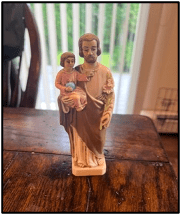 The couple share easily about their comfort from God in April 2020, when Brad was digging the area of the yard that is now a fenced in private dog park for their pet Harley. Brad’s father was hospitalized, and they were scared, as it was the beginning of the pandemic. Brad remembers, “Oh my God, we’re sending him to the hospital, and COVID is killing people…. I remember being back there working on that land, and then digging this (a figurine of Joseph holding Jesus) up, and saying. “This is a sign, you know!”