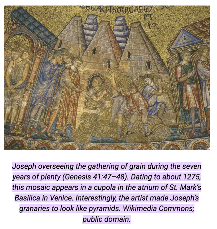 I want to point out two things here. One is that dreams in Joseph’s culture are universally recognized as means of divine communication. (256). “God doesn’t figure explicitly in the content of (Joseph’s or Pharoah’s) dreams; yet it is taken for granted that He is the source of the message begin conveyed. The predictive aspect of dreams was (also) universally assumed in the ancient world.” (256). This is why Pharaoh is so troubled! He knows the dreams are important, but he doesn’t understand them, the assumption being because he doesn’t know the God of Israel, Joseph’s father.