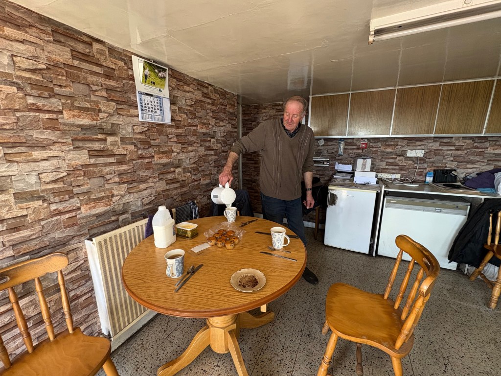 After he fed the sheep, Edward called us into his kitchen so that he could feed us. He had set the table with a couple of old mugs and one small plate for tea bags. He poured our tea and opened packages of blueberry muffins, pancakes, and biscuits. Then he sliced an apple tart, put a generous slab of it into my hand and urged me to eat. It was delicious!