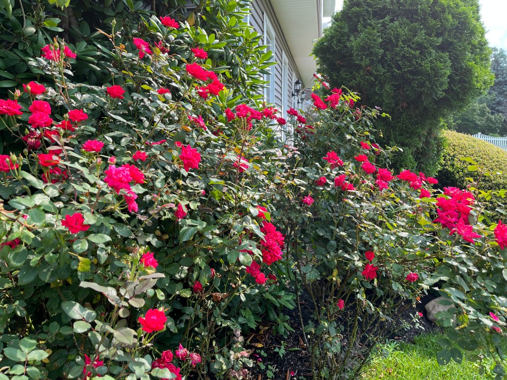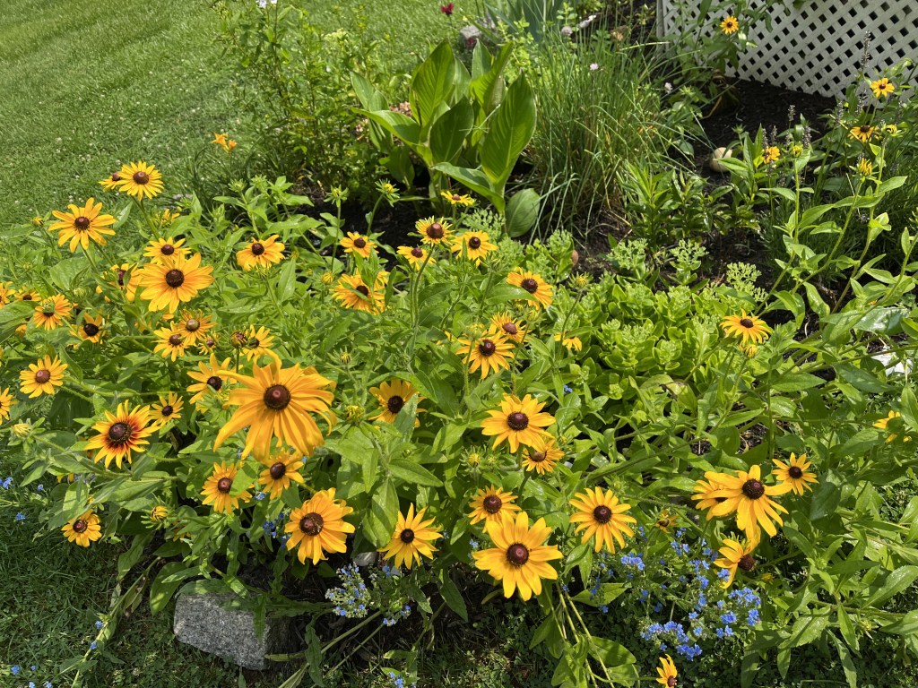 Red roses, bee balm, geranium and tall, spikey cardinal flower. Bright yellow: black eyed Susans and daylilies. Blue: forget me nots, hosta, and hydrangea. Purple catmint, lavender, sage, veronica. Dainty white daisies. Other plants have the look of blooming soon. Phlox. Butterfly Bush. Rose of Sharon. Coral bells.