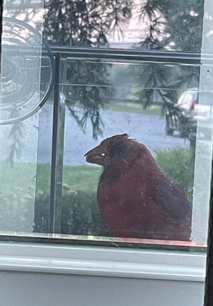 This week, I received an email. They sent me two photographs of birds at her feeder. One was an ordinary blackbird, I think. The other, well, I kept looking at it and looking at it. It was a big red bird. Too big for a cardinal. It had a strange face. I zoomed in, and it dawned on me, it was a chicken!