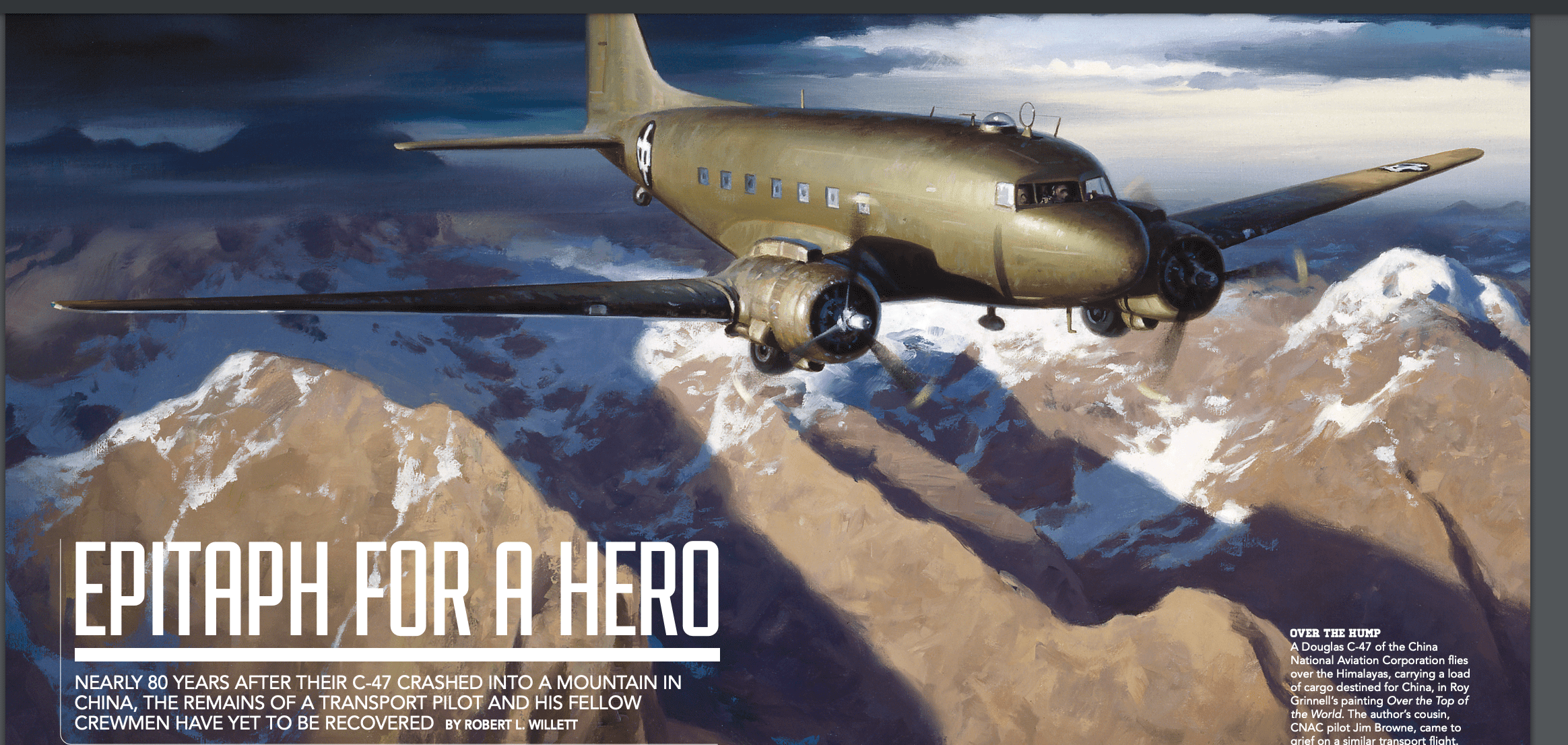 “In those days there were no search and rescue units to look for downed pilots,” Bob says. “CNAC and AAF airmen were asked to look for wreckage as they flew their routes, but snow and high winds soon concealed lost aircraft. Jim’s C-47 joined the ranks of aircraft and crews lost on the pitiless Hump route, ranks that would tragically grow to unpredicted lengths in the coming months.”